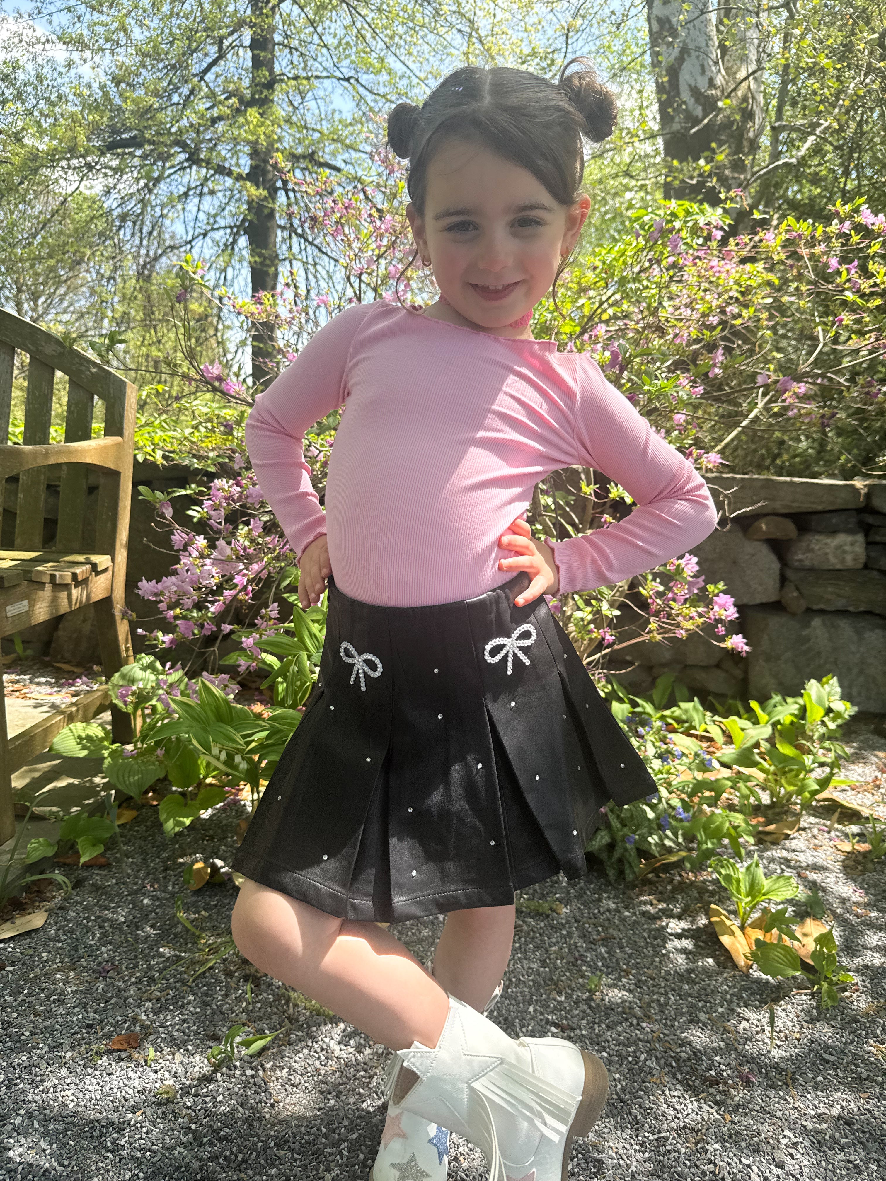 Indulge your little fashionista with our Vegan Leather Gem Skirt. Crafted from sleek black vegan leather, this skirt features a stunning rhinestone bow and sparkles throughout. Your little one will shine and stand out in style.