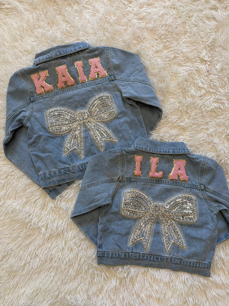 Enhance your wardrobe with our Butterfly/Bow Patched Jacket. The denim jackets come with sparkly, beautiful patches sewn on in-house. Option to personalize with your name for an extra $15. Stylish and unique, perfect for adding a touch of personality to any outfit.
