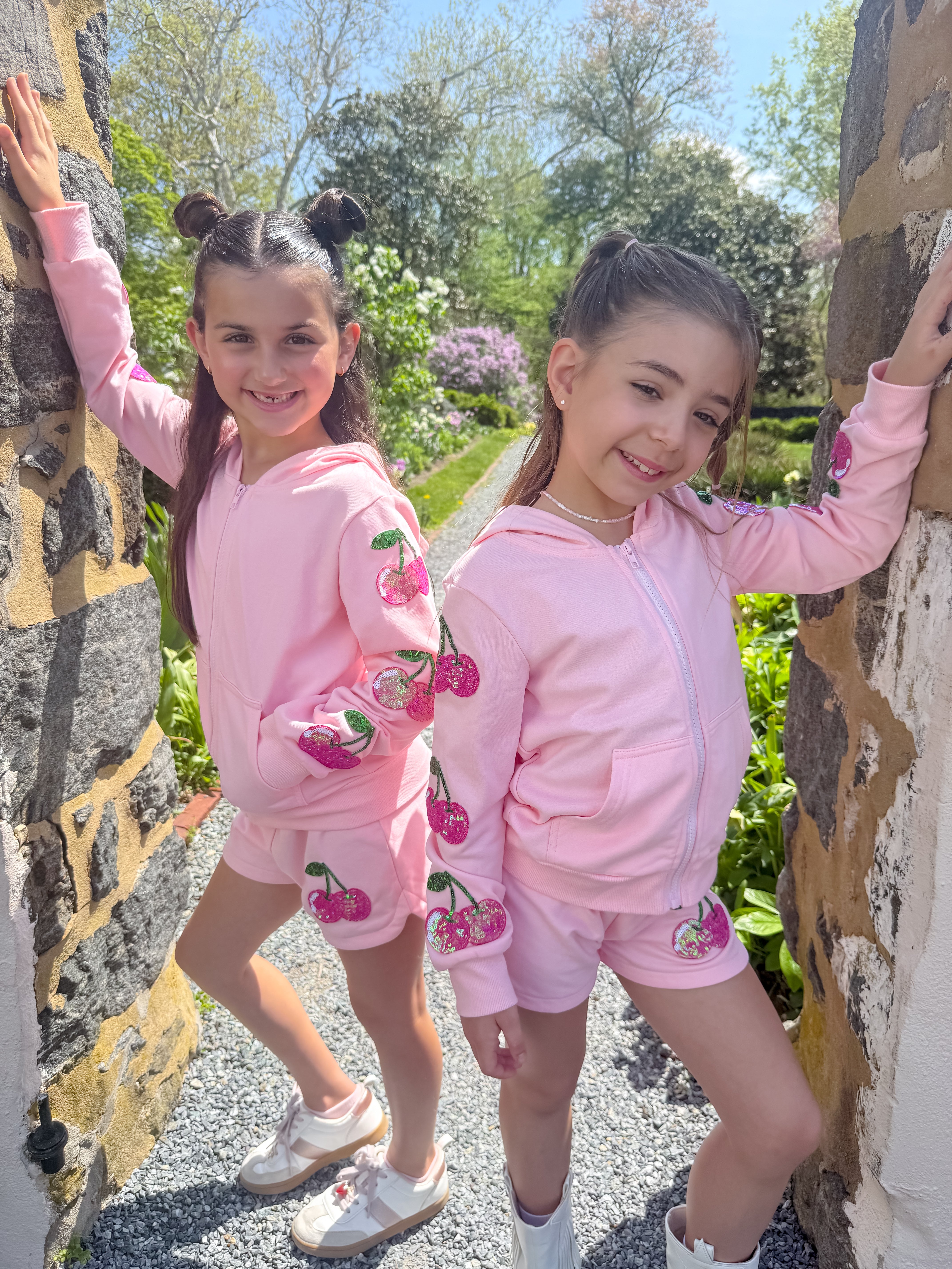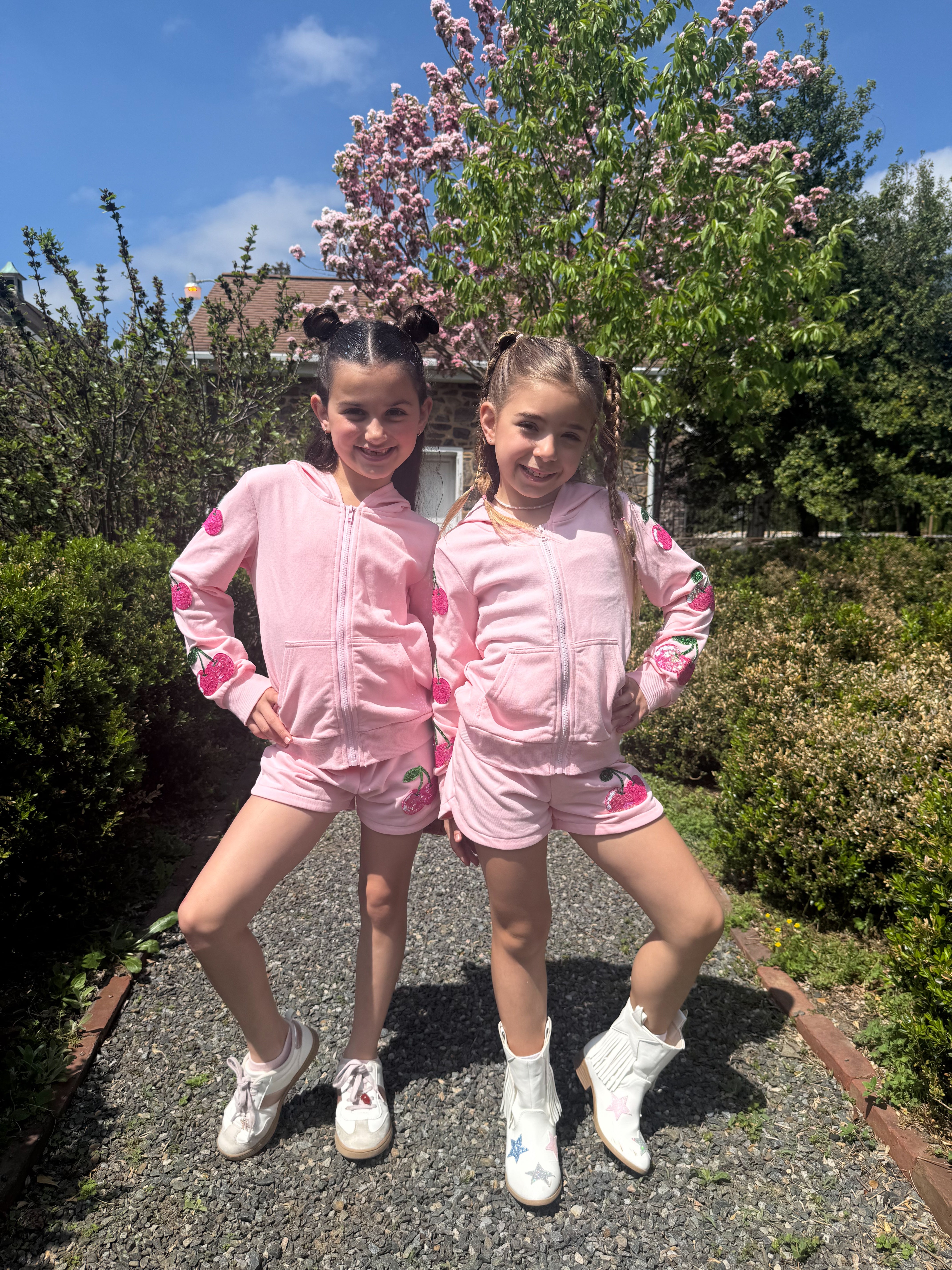 The zip-up hoodie features sparkly sequin cherry accents along the sleeves, paired with matching shorts for the most adorable coordinated look. Wear it together or mix and match β either way, itβs a total outfit moment π
