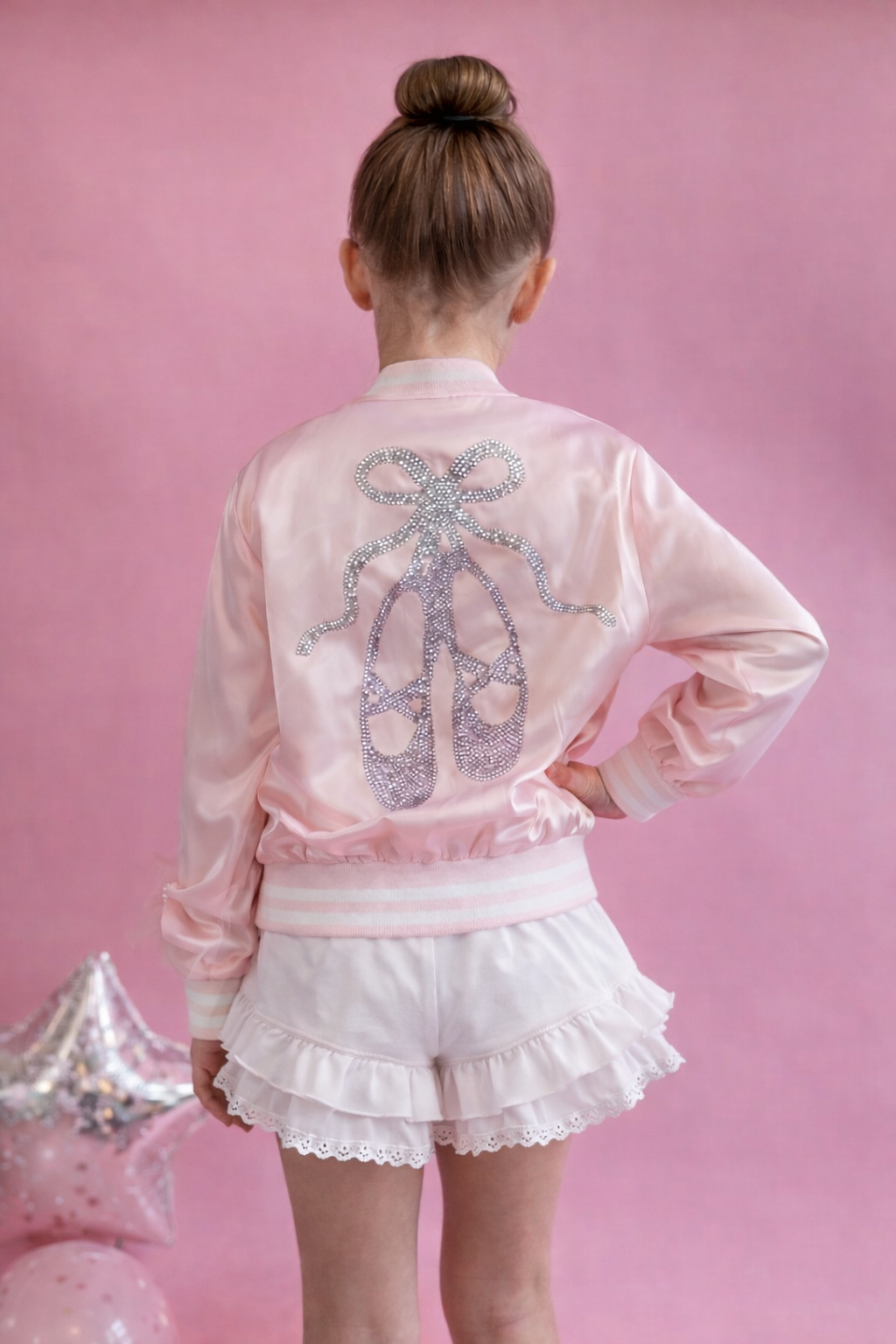 Add this stunning Rhinestone Ballet Satin Bomberbto your dancer's wardrobe. Featuring a comfortable satin material and beautiful ballet slipper detail with rhinestones, this bomber is perfect for your dance girl. The zipper even adds a touch of elegance with a charming heart design. Elevate their style and comfort with this unique piece.