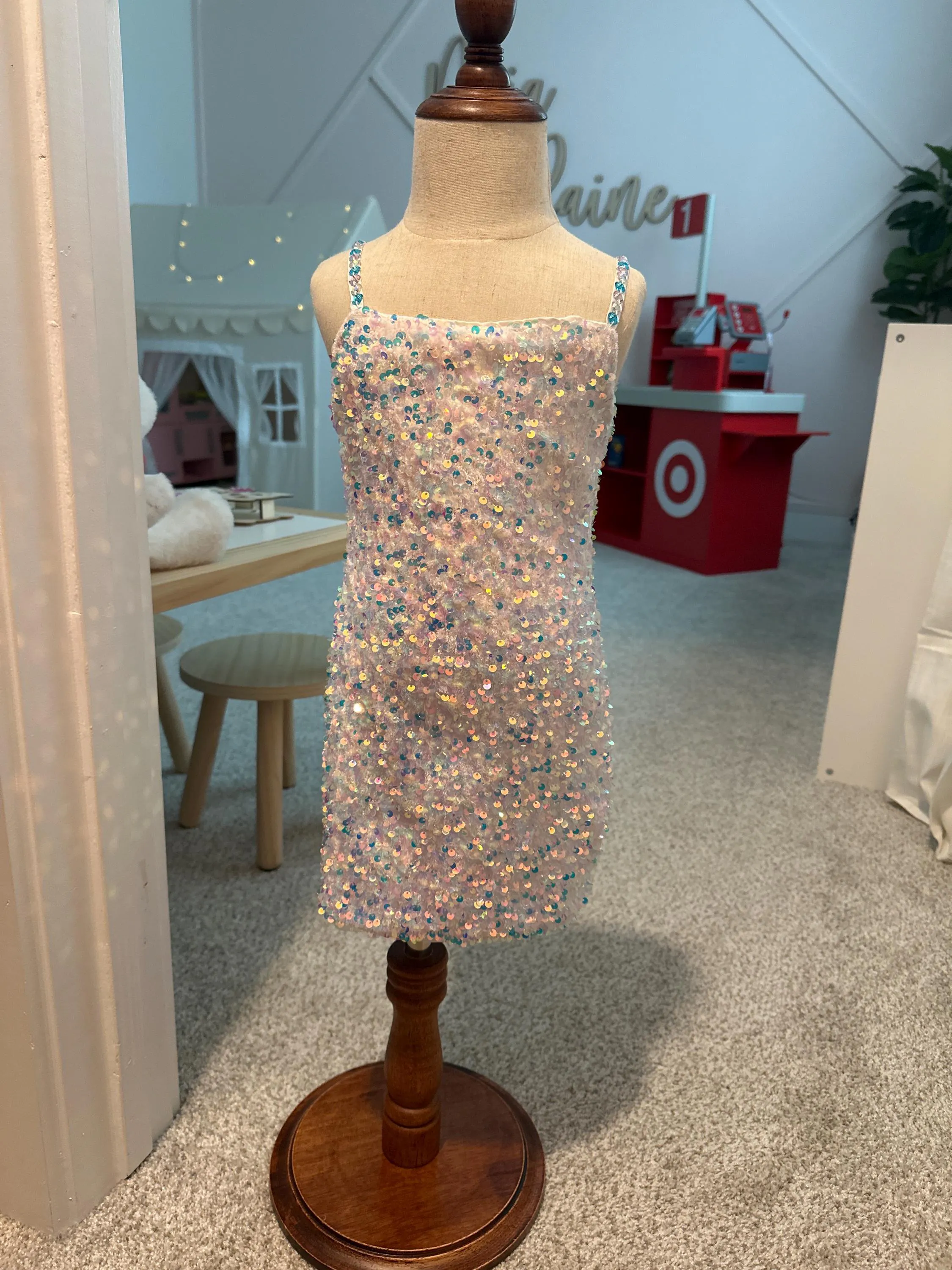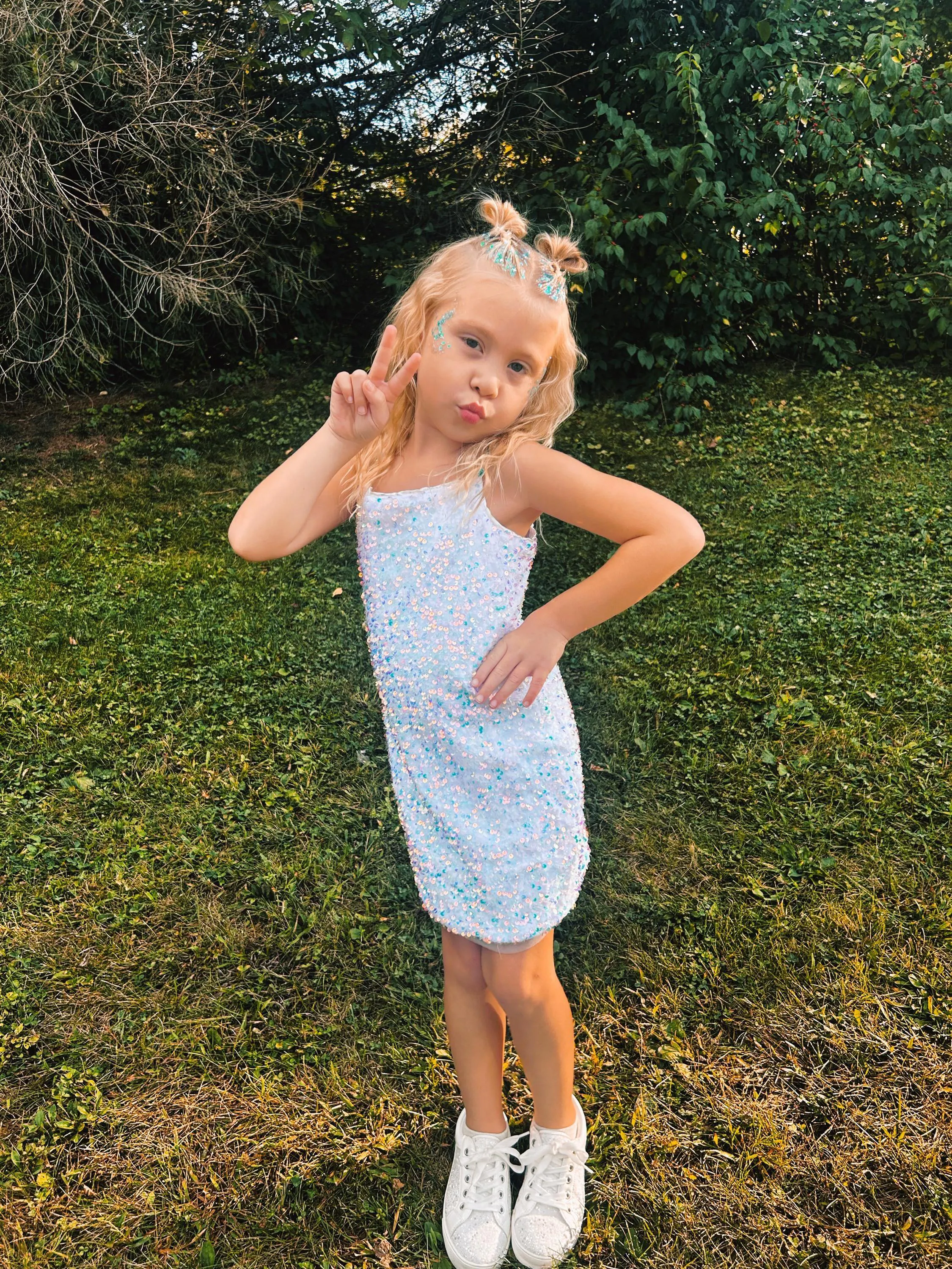 Dazzle in this elegant White Sequin Dress, featuring blue and white heart gems on the adjustable straps. The satin polyester lining adds comfort and style. Perfect for any special occasion, this dress will make you stand out ✨